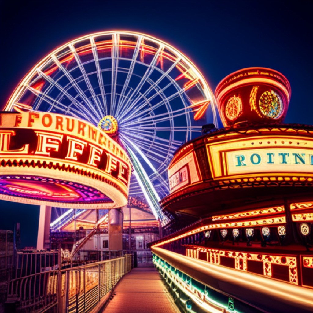 A carnival at night featuring a Ferris Wheel with a sign reading "Ouroboros" and a roller coaster with a sign reading “Life" - with fortune teller / psychic booth in foreground