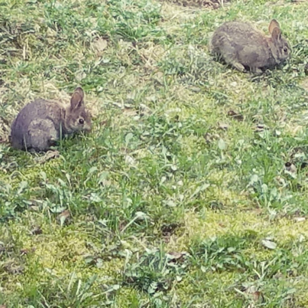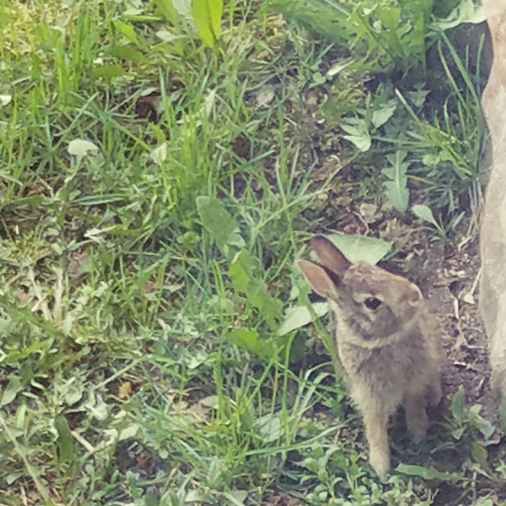 A mother rabbit birthed at least three bunnies in a niche of the house – enclosed on three sides with only a northern mossy exposure – mostly safe and hidden from owls, hawks and coyotes. They nibble on young dandelion and clover leaves. They are joy.