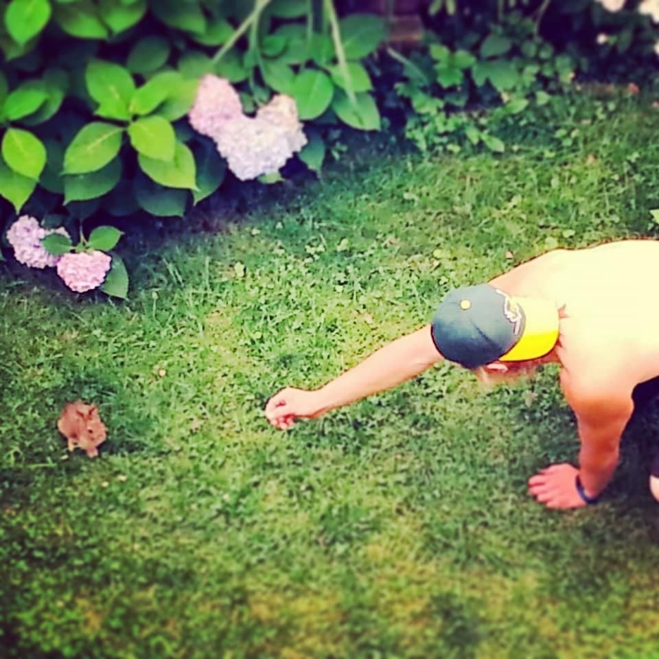 My golden boy communes with an urban bunny in our backyard of clover and hydrangeas.