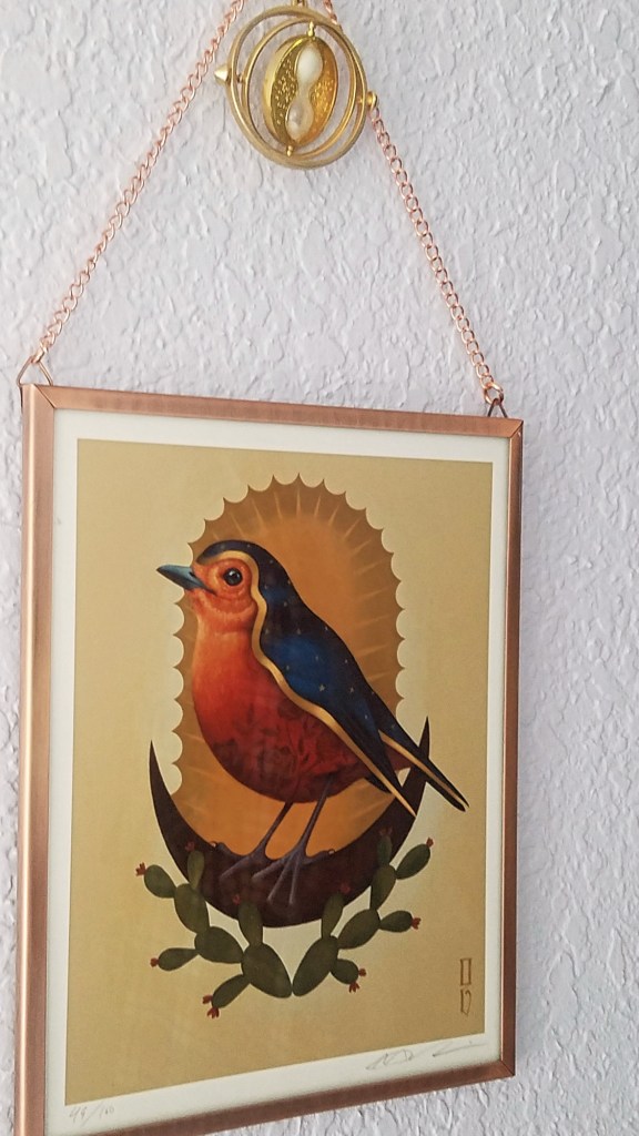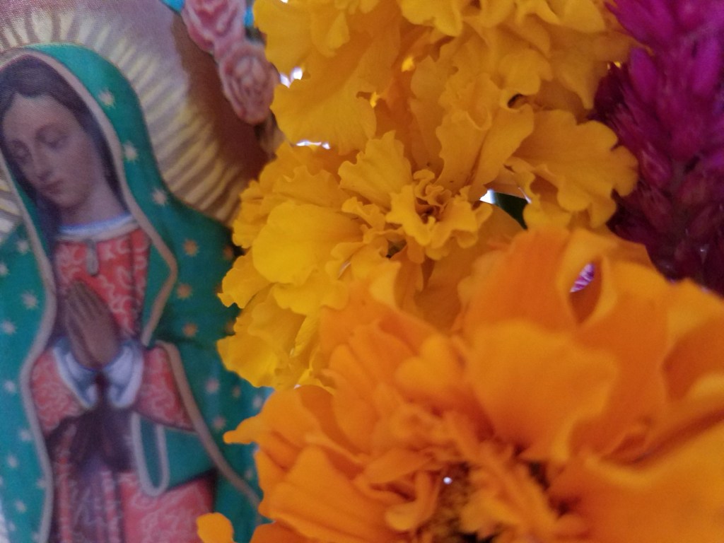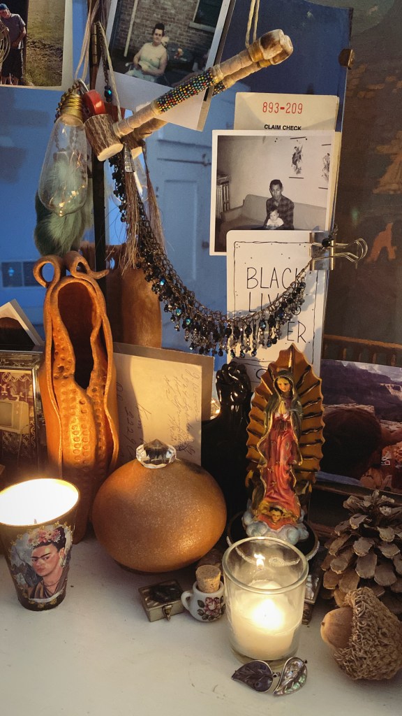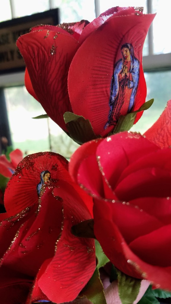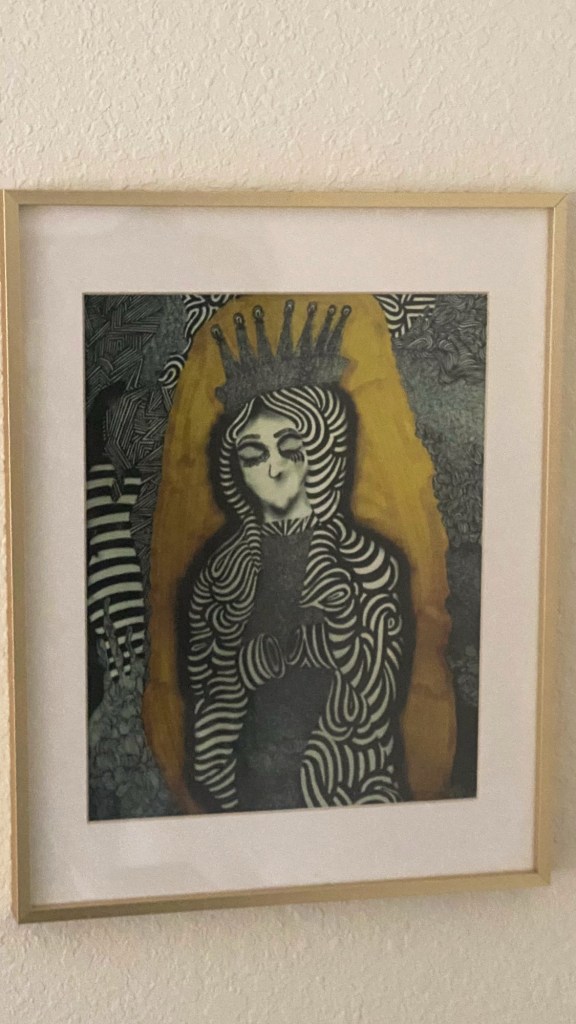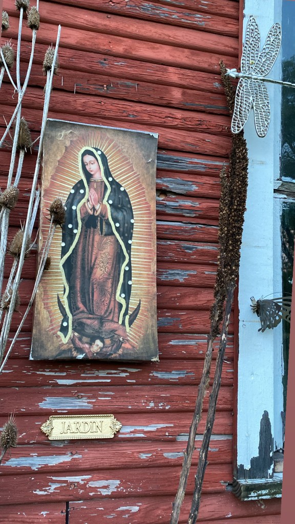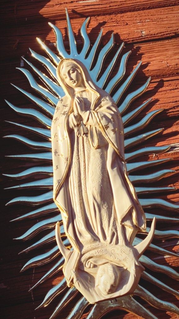 & statuette of a sweet Madonna settin’ on a box of abalone shells.